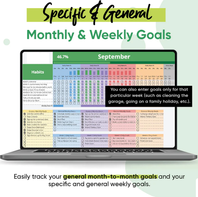Monitor your habit achievements easily and quickly with our complete habit tracker! Track up to 30 daily habits and goals and simply check your progress on beautifully designed, easy-to-use habit planner sheets. Features daily, weekly, monthly, and yearly tracking of habits and achievements!